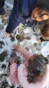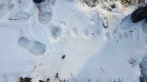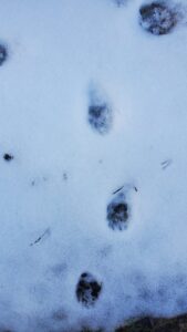 Nous sommes partis à la recherche des traces d’animaux. Mais nous n’avons vu qu’une trace de chien, d’humain et de chevreuil. Les animaux ne se sont pas beaucoup déplacés avec la neige et le froid.