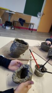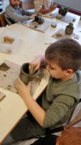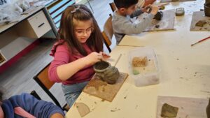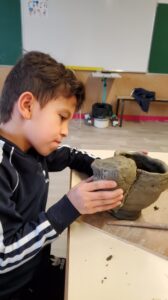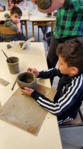 Camille nous a appris à faire un contenant, c’est-à-dire un pot, un vase, un bol en argile. Il faut empiler des colombins ( des boudins d’argile) les uns sur les autres et les lisser pour qu’ils s’accrochent.