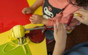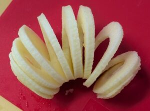 Nous avons d’abord utilisé le pèle-pommes (qui épluche, enlève le trognon et tranche les pommes)