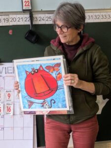 Enfin, elle nous a présenté les esquisses des 4 personnages que nous allons réaliser en papiers collés sur des panneaux en bois lors de se prochaines venues à l’école (en février et avril).